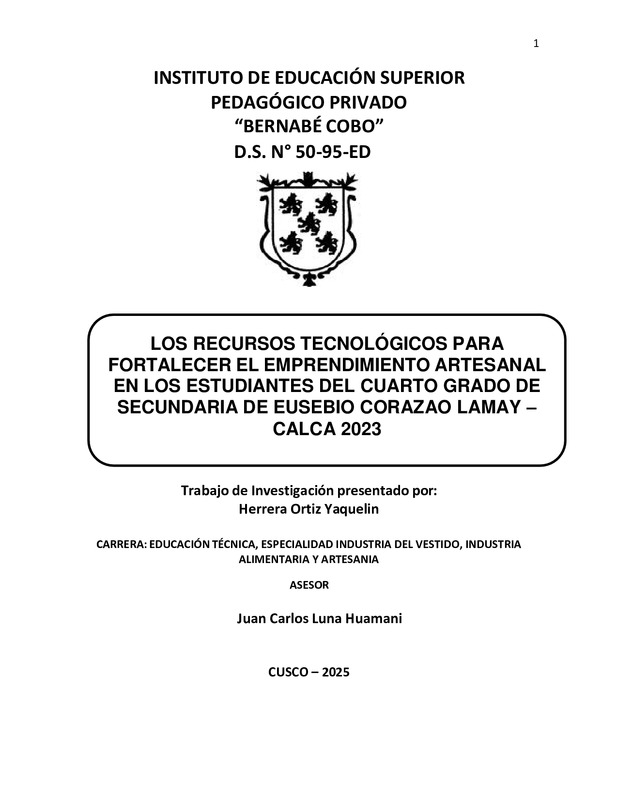 LOS RECURSOS TECNOLÓGICOS PARA FORTALECER EL EMPRENDIMIENTO ARTESANAL EN LOS ESTUDIANTES DEL CUARTO GRADO DE SECUNDARIA DE EUSEBIO CORAZAO LAMAY – CALCA 2023